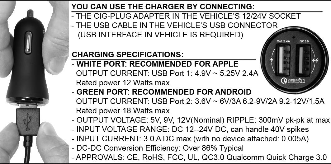 Med USB-kabel + cigg-kontakt adapter med 2 USB portar: QC 3.0A + 2.4A. Med kulled. 12/24 Volt. Passar enheter med skal/skin som har följande mått: Höjd: 160-175 mm, Bredd: 88 mm...(inga omdömen)999 kr Add to cart -