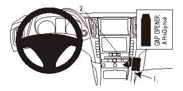 1. Använd den medsända våtservetten till att rengöra området där ProClip-fästet ska monteras. Avlägsna skyddsplasten på den dubbelhäftande tejpremsan. Pressa fästets vinklade högerdel in i springan på mittkonsollens sida.