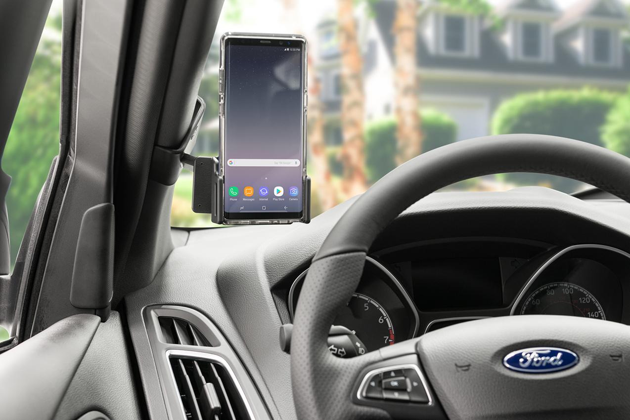 2. Pressa fästet framåt/uppåt så att den vinklade överdelen hakar fast om A-stolpen. Pressa nedåt på fästets överdel så att den vinklade kanten hakar fast ordentligt.